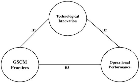 Prior studies focused mainly on the direct effect of GSCM practices on technological innovation [26] and operational performance [68,76]. However, this study provides the direct and indirect influence of GSCM practices on operational performance through technological innovation, as shown in Figure 1. Although the mediating role of technological innovation has been identified in different relationships [77], this research work explicitly proposes the mediating effect of technological innovation on the relationship between GSCM practices and operational performance. Therefore, the conceptualized hypothesis of this research is as follows: