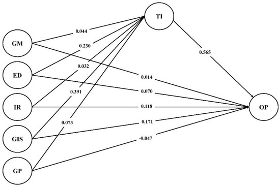 The structured model (hypothetical model) is constructed as shown in Figure 3, to establish the relationships between constructs to achieve the research goals. The hypotheses were tested into two ways. First, there were 5000 bootstrapping samples to test the route coefficient significance of direct path analysis with set variables. After that, the mediation effects of technological innovation between GSCM practice and operational performance were investigated. The R-square value was utilized as the dependent variable to assess the structural model’s explanatory ability. The structural model explained 61% of the variance in operational performance and 45.4% of the variance in technical innovation, demonstrating its predictive validity. The R-square criteria classify R-square values of 0.67, 0.33, and 0.19 as considerable, moderate, and weak, respectively. R-square value changes can be used to see if the external latent variable significantly influences the endogenous latent variable. The f-square effect size may be used to quantify this and the projected effect. Exogenous latent variables with minor, moderate, and strong structural impacts have f-square sizes of 0.02, 0.15, and 0.35, respectively [98,103,104]. It has been demonstrated that all the f-square values are greater than 0.020 and 0.35, indicating a significant effect on the model’s validity. Furthermore, when Q-square values are greater than zero, the model has predictive significance [105]. Therefore, the R-square and Q-square values meet the dependent variables allowed range, as shown in Table 9.