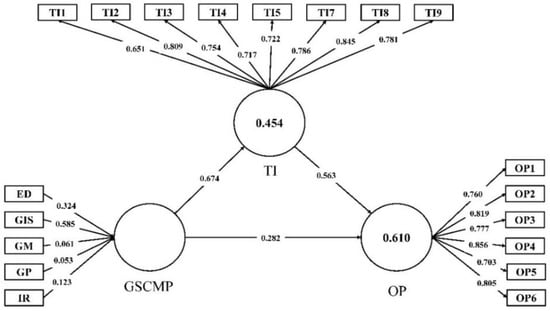 The first hypothesis was about the significant influence of GSCM practices on technological innovation. The link between independent and dependent variables was tested by path coefficient and t-statistics. The positive and significant impact of GSCM practices was observed on technological innovation (t = 16.282, β = 0.674, p < 0.001). The second hypothesis was about the significant influence of technological innovation on operational performance. It was observed that the technological innovation has a significantly positive association with operational performance (t = 8.958, β = 0.564, p < 0.001). The third hypothesis was about the significant influence of GSCM practices on operational performance. This hypothesis was also supported, as there was also a significant and positive relationship was found between GSCM practices and operational performance (t = 4.489, β = 0.281, p < 0.001). The fourth hypothesis was about the mediating impact of technological innovation within GSCM practices and operational performance. The findings show that through the mediation of technical innovation (t = 8.144 β = 0.38, p < 0.001), GSCM practices have a considerable indirect effect on operational performance practices through technological innovation. This result indicates that technological innovation partially mediates the relationship between GSCM practices and operational performance. It means that technological innovation in the product and process of manufacturing firms will enhance the combined effect of GSCM practices (eco-design, green manufacturing, green purchasing, green information systems, and investment recovery) on operational performance (product quality, operational cost, and flexibility) in the organization. Hence, H1 (GSCMP → TI), H2 (TI → OP), H3 (GSCMP → OP), and H4 (GSCMP → TI → OP) are all supported, as shown in Table 10.