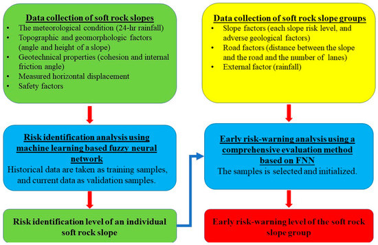 Therefore, for the purpose of this study, we adopt a comprehensive evaluation method based on an FNN model for the identification and early warning of risks considering multiple soft rock slopes associated to a highway. First, an FNN-based model is developed for the risk identification of an individual soft rock slope. On this basis, we use a comprehensive evaluation method based on the FNN to build an early-warning model, in order to determine the soft rock slope group risk. The model is trained and validated using a large amount of highway soft rock slope data collected on a highway located in southern China.