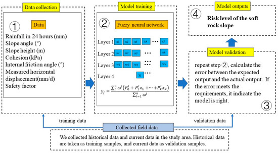 Figure 2 shows the details of the FNN model developed to analyze the risk of an individual soft rock slope. It consists of data collection, model training, model validation, and model outputs.