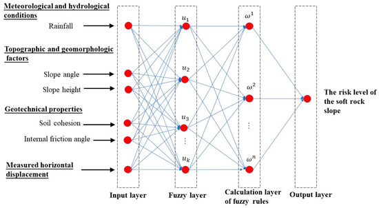 As shown in Figure 3, the FNN used to identify the soft rock slope risk is composed of four layers: an input layer, a fuzzy layer, a of fuzzy rules calculation layer, and an output layer.
