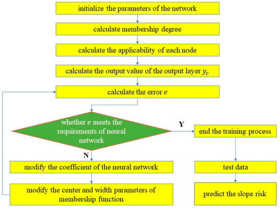 (1) Initialize the FNN. We used the FNN structure that was described in Section 3.1.3 for risk identification of the soft rock slope. In the neural network model, the number of training samples is generally required to be larger than the number of validation samples. The number of training samples generally accounts for 2/3 to 9/10 of all samples, or even larger. The proportion of training samples can be adjusted, according to the actual situation. We divided the collected sample data into training samples and validation samples according to our actual needs. Before training, all samples were pre-processed by normalization [63]. The fuzzy membership parameter was then obtained using a random function.