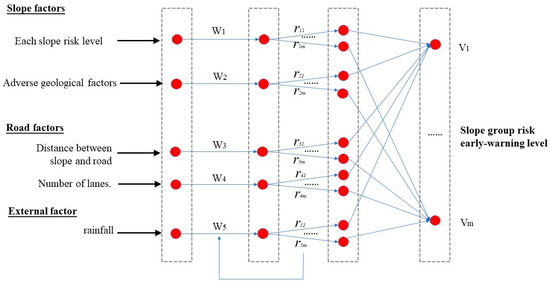 The soft rock slope group risk early warning model adopts a comprehensive evaluation method based on an FNN [51], as shown in Figure 6. The input layer of the model of the soft rock slope group risk early warning should have five neuron nodes: the risk level of each soft rock slope, the distance between the soft rock slope and the road, the number of lanes, the 24-h rainfall, and the adverse geological factors. The output layer also has five neuron nodes, which respectively correspond to the soft rock slope group early risk-warning levels: I (extremely low), II (low), III (medium), IV (high), V (extremely high). For more information on the determination of the index weights and evaluation matrix, they have been previously detailed in the literature [51]. To achieve a unified purpose, the evaluated matrix and weight coefficients are taken as the input weights of the neural network, and the existing sample data are used to train the network. Then, the evaluated matrix is modified, according to the error back-propagation method. Finally, the weights are adjusted using the modified evaluated matrix.