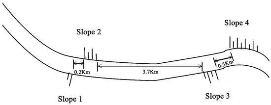 According to the definition given in [52], a soft rock slope refers to a kind of slope which is mainly composed of soft and weak rock strata with low strength, high porosity, poor cementation, significant impact of structural surface cutting and weathering, and/or containing a lot of expansive clay minerals (e.g., mudstone, shale, siltstone, and argillaceous sandstone). The soft rock slope group is established based on a so-called “geo-domain”, which represents multiple soft rock slopes with similar geotechnical characteristics that are located in the same geological region [52]. In the present study, the soft rock slopes along a highway are grouped based on the distance between the soft rock slope and the road. The closer the soft rock slope is to the road, the greater the impact of a landslide on the road. As previous research work on soft rock slope engineering [53,54] has suggested that the impact of a landslide is generally seen up to 30 m from a soft rock slope, we mainly focus on a group of soft rock slopes with distance less than 30 m from a highway.