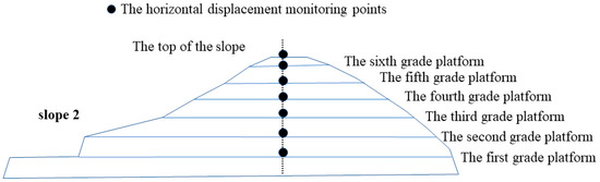 According to the engineering monitoring data [67] and Table 7, the first- and second-grade ditches of slope 1 and the outside of the slope 1 were seriously washed by rain; the second-grade platform ditch of the slope 3 was seriously washed by water, and the frame beam had separated from the slope surface. In terms of slope 4, there was a small area collapsed in the ditch at the top of the fifth-grade platform, and small cracks had occurred in the arch skeleton of the fourth-grade slope. The overall evaluation result of the object soft rock slope group issued by the engineers was dangerous: the soft rock slope group was in a potentially dangerous and unstable state, with a rate of horizontal displacement over 5 mm/d and local cracks on the soft rock slope surface and top. Thus, the soft rock slope group was considered prone to losing its stability, thereby affecting the nearby highway.