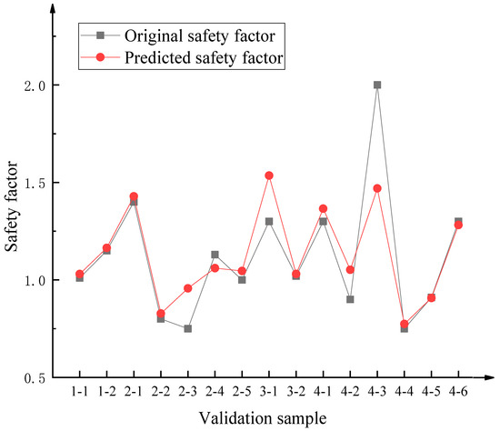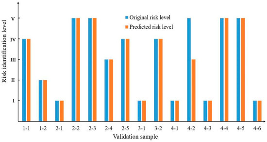 To verify the accuracy of the developed soft rock slope risk identification model, validation samples are required. The validation samples were used as input to the model, in order to predict the results on the validation sample using the trained FNN. Once the prediction results for the risk level and safety factor were obtained, we compared them against the original risk level and safety factor. After the FNN model was verified as being correct, we then used the model to predict the soft rock slope risks.