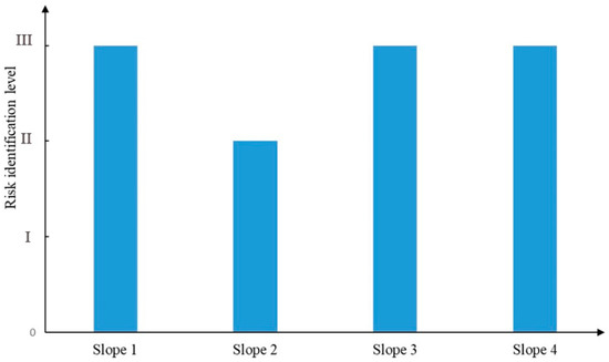 (1) Soft rock slope risk level. According to risk identification for the individual soft rock slope, each soft rock slope risk’s level takes into considered the influence of the soft rock slope angle, soft rock slope height, cohesion, internal friction angle, and measured horizontal displacement. The risk level of each soft rock slope in the group has an important influence on the risk level of the soft rock slope group.