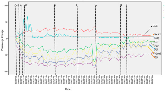 Figure 1. Time series analysis for daily mobility changes in Resd—Residential, GP—Grocery and Pharmacy, Par—Parks, RR—Retail and Recreation, Work—Workplaces, TS—Transit Stations, and R(t)—effective reproduction number. Note: The doted lines in Figure 1 indicate dates when certain KSA Government measures were initiated: A—WHO declared COVID-19 pandemic; B—Suspension of work place attendance and suspension of social events, sports, domestic flights, and daily and Friday prayers in mosques; suspension of all domestic public transport, flights, trains, buses and taxis; D—Partial curfew implemented; E—Mass PCR screening test; F—Complete curfew across KSA; G—Curfew lifting gradually, allowing domestic travel between regions and cities, opening some economic activities and allowing Friday and daily prayers while adhering to precautionary measures. Lifting suspension of attendance to workplaces in government and government agencies. Lifting suspension of domestic public transport, flights, trains, buses, and taxis; H—Back to normal life with preventive health instruction and social distance; I—Hajj permitted with restrictions.