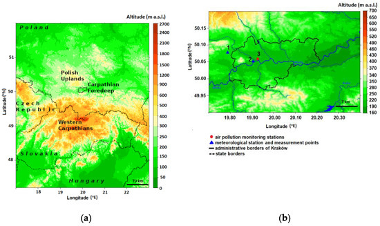 Kraków is the second largest city in Poland, located in the Małopolska (Lesser Poland) region, with an area of 326.8 km2 and the number of inhabitants reaching almost 800,000 [45]. The Kraków agglomeration consists of the city itself and the highly populated towns and villages which surround it, and the total number of inhabitants is estimated to exceed 1 million. The city’s area belongs to three different geographical regions and geological structures presented at Figure 1, i.e., the Polish Uplands, the Western Carpathians, and the basins of the Carpathian Foredeep in between. The central part of the city is located in the Wisła River valley, at an altitude of about 200 m a.s.l. In the western part of Kraków, the valley is as narrow as 1 km; however, in the eastern part of the city, the valley widens to about 10 km and there is a system of river terraces (Figure 1b). The hilltops bordering the city to the north and the south reach about 100 m above the river valley floor, similar to the hilltops in the western part of the valley which means that the city is located in a semi-concave landform (open only to the east) and sheltered from the prevailing western winds (Figure 1b). The local scale processes linked to the impact of relief include, for example, katabatic flows, cold air pool formation, frequent air temperature inversions, much lower wind speed in the valley floor than at the hilltops [46]. All the factors mentioned contribute to the poor natural ventilation of the city, and one of its consequences is the occurrence of high PM10 concentration levels, especially during heating seasons.
