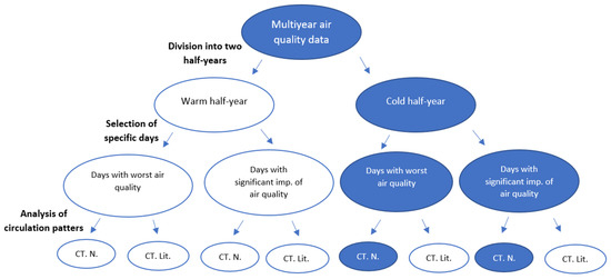 Procedure of data and analyses selection; elements with blue background represent research steps described in detail in the article. Explanation: CT. N.—atmospheric circulation types by Niedźwiedź; CT. Lit—atmospheric circulation types by Lityński.