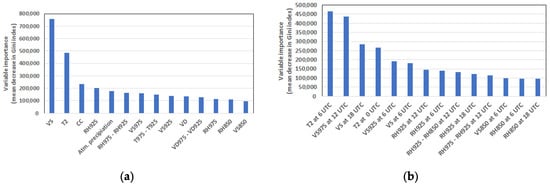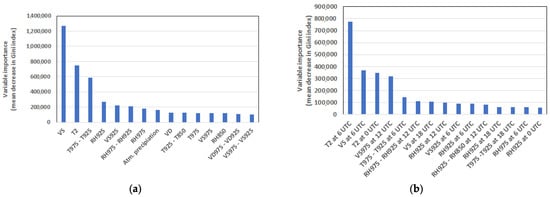 Variable importance plots for Random Forests models trained to predict PM10 daily levels in Krasińskiego air quality station with use (a) daily averages (b) 6-h resolution of meteorological parameters in cold half-years. Explanation: T2—temperature at 2 m a.g.l.; VS—wind speed at 10 m a.g.l.; VD—wind direction at 10 m a.g.l.; RH975, RH925 and RH850—relative air humidity at 975, 925 and 850 hPa, respectively; T975, T925 and T850—air temperature at 975, 925 and 850 hPa; VS975 and VS925—wind speed at 975 and 925 hPa; VD975 and VD925—wind direction at 975 and 925 hPa.