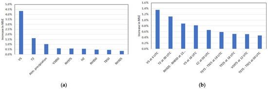 Increase in mean square error (MSE) of predicted PM10 daily levels by Random Forests models with use (a) daily averages (b) 6-h resolution of meteorological parameters in cold half-years. Explanation: T2—temperature at 2 m a.g.l.; VS—wind speed at 10 m a.g.l.; CC—cloudiness; RH975, RH925 and RH850—relative air humidity at 975, 925 and 850 hPa, respectively; T975, T925 and T850—air temperature at 975, 925 and 850 hPa; VS975—wind speed at 975 hPa.