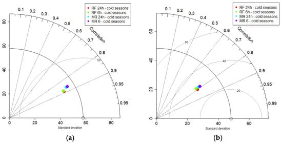 Taylor diagram for (a) predicted PM10 daily concentration and (b) day-to-day PM10 daily concentration changes for Random Forests (RF) and multilinear regression models (MR) in cold half-years.