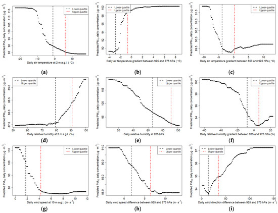 Partial dependence plots of daily (a) air temperature at 2 m a.g.l., (b) air temperature gradient between 925 and 975 hPa, (c) air temperature gradient between 925 and 975 hPa, (d) relative humidity at 2 m a.g.l., (e) relative humidity at 925 hPa, (f) relative humidity gradient between 925 and 975 hPa, (g) wind speed at 10 m a.g.l., (h) wind speed difference between 925 and 975 hPa and (i) wind direction difference between 925 and 975 hPa for the cold half-year obtained from Random Forests model. Subfigures present lower and upper quartiles of selected parameters in the cold half-years.