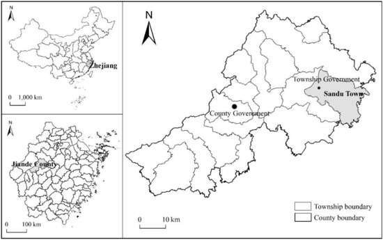 Rural environmental issues have been common and have aroused wide concern in China. In the governance of rural living environments nationwide, Zhejiang Province has always attached great importance to living environmental protection and has been at the forefront of the country. Meanwhile, Jiande County in Zhejiang has been elected one of the incentive candidate counties with great achievements in rural environmental governance in 2020 by the Ministry of Agriculture and Rural Affairs of China (Available online: http://www.moa.gov.cn/xw/zxfb/202103/t20210308_6363201.htm (accessed on 21 November 2021)). Our case study area, Sandu Town, is one of the townships of Jiande County and is located in the east of China (Figure 2). It spans an area of 1.83 × 102 km2 and has 19 administrative villages. The terrain here is dominated by hills, and the town lies at the intersection of the Fuchun, Xin’an, and Lanjiang rivers. Sandu’s economy is continuously promoted by rural tourism and the homestay industry, which calls for more pleasant surroundings.