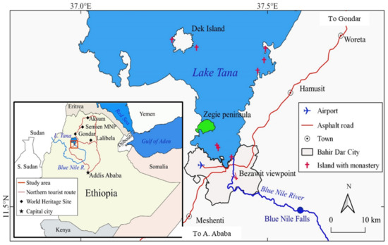 Location map of the study area (southern Lake Tana region with its island monasteries, Zegie peninsula, Bahir Dar City, Bezawit viewpoint, and the Blue Nile Falls). The inset map shows the location of the study area in the northern tourist route of Ethiopia.