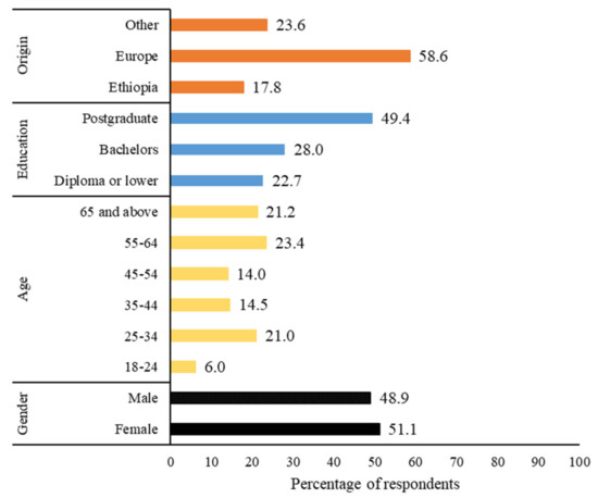There were an almost equal number of women (51.1%) and men (48.9%) among the respondents (Figure 2). In addition, about one-fifth of the respondents (21.2%) were in the age range of 65 and above, and over half of the respondents (58.6%) were in the age range of 45 and above. Furthermore, nearly half of the respondents (49.4%) had attained a postgraduate degree. The respondents were from over 30 countries, but most were from Ethiopia (17.8%), Italy (14.7%), France (14.0%), the USA (8.7%), Germany (8.4%), and the UK (4.8%).