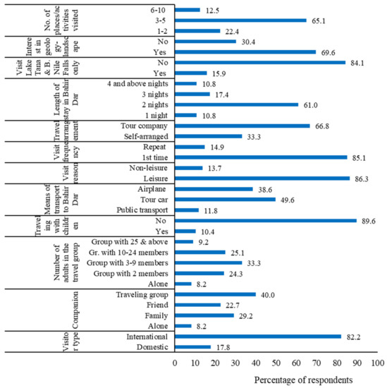 Most tourists (69.6%) indicated their interest in attractions related to geology/landscape. Few tourists (15.9%) visited Lake Tana and/or the Blue Nile Falls only. In other words, many tourists visited Lake Tana and/or the Blue Nile Falls and other less popular attractions in the southern Lake Tana region. The mean number of sites in the region visited by the respondents were 3.7 (with SD = 1.6). About two-thirds of the respondents (65.1%) visited three to five sites in the region.