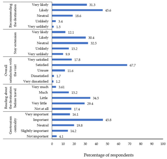 Concerning the behavior of the respondents, ca. half (45.8%) indicated that learning about geosites was an important reason for visiting the southern Lake Tana region (Figure 4). Nearly half of the respondents (46.8%) mentioned that they read nothing or very little about the destination before traveling. In addition, the majority of respondents (85.5%) indicated that they were (very) satisfied with their overall visit to the destination. Moreover, about one-third of the respondents (30.4%) were likely to stay longer than their actual stay and visit more geology/landscape-related attractions in the southern Lake Tana region. Furthermore, about three-quarters of the respondents (76.9%) were (very) likely to recommend that other people visit Bahir Dar and its vicinity.