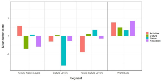 | Segment | Factor 1 Activities | Factor 2 Relaxation | Factor 3 Nature | Factor 4 Culture | Number of Respondents (n = 415) | % of Segments in Total Sample |