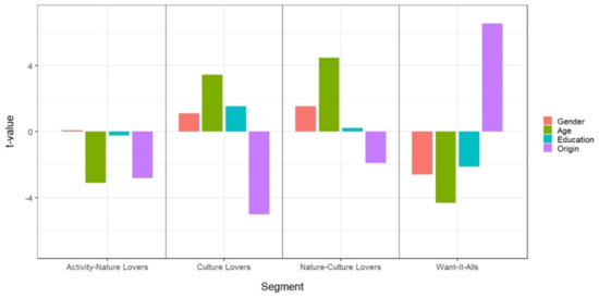 | Segment 2: Culture Lovers | −0.36 | −0.21 | −1.10 | 0.24 | 57 | 13.73 |