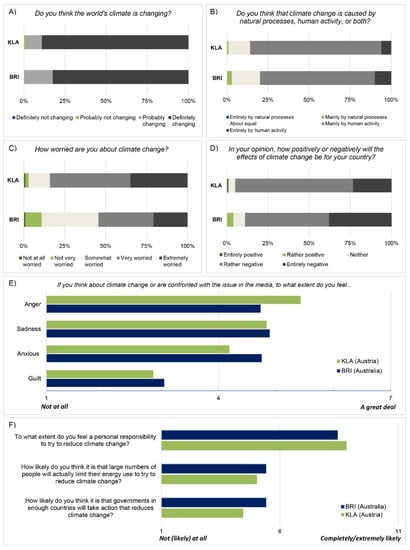 Comparative views on climate change between respondents from BRI, Australia (n = 99) and KLA, Austria (n = 196), when asked how one thinks as to, (A) whether the world’s climate is changing, (B) whether it is caused by natural or human processes; (C) how worried one is to climate change; (D) whether climate impacts will be positive or negative; (E) the extent of emotions one feels toward climate; and (F) how responsible one feels to reduce climate change, and the likelihood that large numbers of people and/or governments will take action to reduce climate change. (A–D) are the % of respondents by response; (E,F) are the mean Likert scores.
