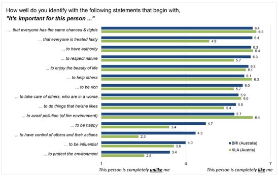 To gauge what values people regarded as most important, respondents were asked to rate how well they identified with a person of various social, environmental, and economic principles. In general, the majority of values listed were very deemed important for both KLA and BRI samples (X > 5/7), with only four values that respondents did not identify with (Figure 2). Overall, altruistic values rated highly among respondents. For example, [It is important for this person…] that everyone has the same chances and rights scored highest, and to help others, to care for those in a worse situation and also scored high. However, self-centered values, such as to be rich and to have authority, and to do things that he/she likes also scored fairly high, yet other self-centered traits such as to have control over others and their actions, to be influential, and to be happy were some of the lowest-ranking, though BRI respondents regarded these values more important than those from KLA. From an environmental perspective, respondents felt a high sense of values in terms of, respecting nature, and avoiding pollution, but did not relate this to protecting the environment which ranked least important in both samples. This suggests that respondents feel a personal responsibility to avoid environmental damage and their climate footprint, they feel less inclined to play an active role in preventing other actors doing so. This may be associated with a perceived ability to do something about climate change (e.g., ride bikes, use less energy, catch public transport), than to make an impact to the natural world.