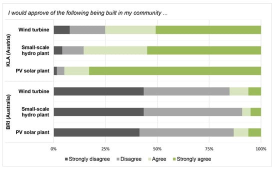 Finally, the most striking difference of climate change views between KLA and BRI samples was the acceptance toward renewable energy projects being situated within their own community (Figure 3). Whilst a majority of KLA respondents would agree to a solar PV, wind turbine, or small-scale hydro plant being built close by, an opposite trend occurred for BRI respondents, with most disapproving. This may be due geographic factors and norms, with many renewable projects in Australia being located in rural and remote areas, whereas in Austria and throughout Europe, space limitations have made local renewable energy facilities commonplace.
