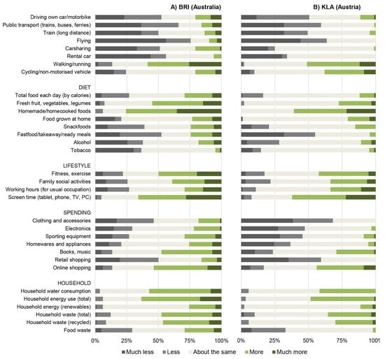 Dimensions of and changes in sustainable behavior during the first months of the COVID-19 pandemic in university students in (A) BRI, Australia (left panels, n = 99) and (B) KLA, Austria (right panels, n = 196). Values denote % respondents by response as indicated in legend.