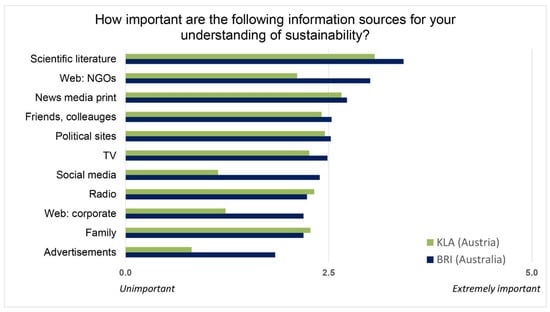 This result concurs with findings from existing studies in the area of sustainable consumption [4,9,20]. Private conversations apparently play a key role in social learning processes, in the creation of sense and meaning and the confirmation of a certain behavior as more or less sustainable so that it then turns into being more associative than rule-based. As mentioned at the beginning of the paper, a “normalization” of behavior happens in a social context, social learning is therefore influenced by interpersonal communication mainly. The lack of individual conversations with family, friends and colleagues and the increased skepticism towards the media, as further elaborated in the next paragraph, indicate that social learning for sustainability is less progressed in Australia compared to Austria.