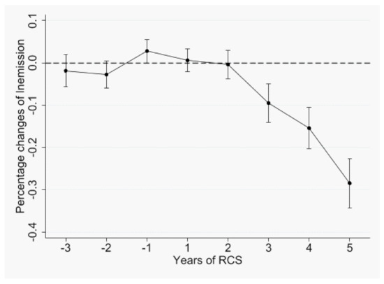 We next checked the possible heterogeneity with respect to enterprise ownership. Compared to private firms and foreign firms, state-owned firms usually gave higher priority to social responsibility than profit maximization, and could thereby be assigned more stringent abatement targets; however, political protection from local governments and the attempt to stabilize employment suggest that state-owned firms may receive less stringent regulations. Hence, the effect of the RCS on state-owned firms is ambiguous. Foreign firms primarily have advanced abatement technologies and, hence, a lower cost of emission abatement [21]. Private firms generally have no technological advantage compared to foreign firms, and they receive, on average, less political protection from local governments than state-owned firms do. Therefore, the negative impact of the RCS may be the largest for private firms. We ran the specification (1) on the three sub-samples of state-owned, private, and foreign firms, and the results are presented in Table 6.