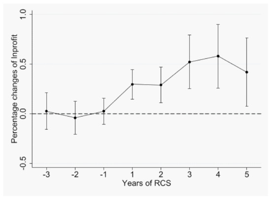 On average, the RCS significantly reduced the firm-level COD emissions by 3.7% at the level of 1%. This is consistent with other studies that found that the RCS reduced the COD emissions at the prefectural level by 6% along the Yangtzi river [2]. Hence, the RCS can improve the water quality in pilot prefectures, which may explain why the central government required it to be implemented nationwide by 2018. On the other hand, while the reduction in emissions may indicate a reduction in firms’ output, the average profit of polluting firms significantly increased by 3.14% at the level of 1%. We will investigate possible channels through which the RCS affects polluting firms’ profits in Section 5. The signs of the coefficients of the controls are consistent with economic intuition.