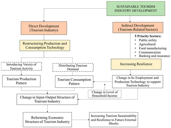 In another perspective, indirect development, this development intends to increase the resilience of tourism-related sectors/industries by reducing their reliance on tourism activities. Effective policy to promote production and consumption for producing their goods and services to other sectors in an economy has to be undertaken. This will increase resilience of the entire tourism supply chain; in return, the tourism-related sectors will reduce their vulnerability to future tourism shocks. Flagship industries and their characteristics must be considered during the planning process. Regarding evidence from our study, in the context of Thailand, we prioritized and considered five priority sectors, including public utility, agriculture, food manufacturing, communication, and banking and insurance. These sectors were selected based on the current tourism input–output structure, and are likely at high risk to future tourism shock. Based on our multipliers calculation indicated in Table 1, a seller characteristics such as the public utility sector (FL > BL), the policy development should focus on simulating the “output” perspective. Supporting them to distribute their output products to meet various customers should be undertaken. For buyers, such as food manufacturing (BL > FL), the development policy should encourage utilization of the “input”. Enhancing their production technology, utilized apart from traditional input, should be considered. In total impact of the indirect development, a change in consumption and production of tourism-related sectors will have a result on household income, leading to a change in tourism final consumption.