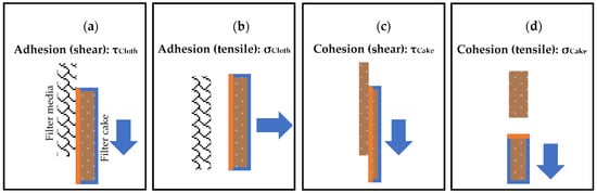 For the description of the detachment behavior of filter cakes, four stresses are relevant [], which are shown in Figure 1. A distinction must be made between adhesion as the stress between two different systems (e.g., filter medium and cake) and the cohesion of the cake itself. In each case, a further subdivision can be made into shear stress τ and tensile stress σ. The volume on which the force acts is depicted in blue, whereas the surface associated with the stress is shown in orange. The sketched stresses and their abbreviations in this paper are as follows: