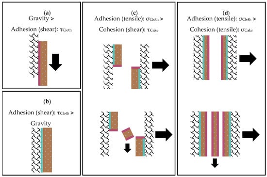 A common problem is an incomplete cake detachment (complete sticking or partial detachment). There are several cake detachment scenarios where the loading parameters mentioned in Figure 1 are crucial. Figure 2 shows these scenarios. It can be divided between the requested detachment (a) and the problematic cases (b–d). In detail, these can be described as follows: