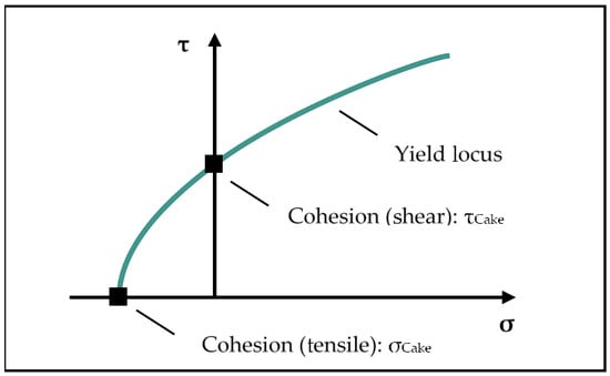 Relationships and derivable quantities can be depicted in a plot out of experimental shear measurement data, which are referred to as the yield locus and schematically illustrated in Figure 3. Consolidated bulk material starts to deform or rearrange under stresses above the yield locus. Such networks (e.g., filter cakes) have a positive shear stress of σ = 0, which is referred to as cohesion (shear) in this paper. The tensile strength of cohesive networks at τ = 0 occurs for negative normal tensions, which is referred to cohesion (tensile) in this paper. The yield locus for tensile fracture ends vertical to the abscissa [].