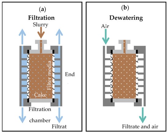 The filter cake is a network of solid particles whose structure and properties are strongly dependent on the particle size distribution of the slurry. Clay-sized particles, for example, cause compressible behavior []. Normally, tailings have a relevant content of clay and corresponding filter cakes are therefore compressible [,,,,]. In order to ensure achieving crucial residual moisture contents, compaction of the network of solid particles by sufficient filtration pressure is necessary. For this reason, filter presses are used in a lot of applications [,,,,]. Furthermore, mechanical dewatering by applying gas differential pressure can be implemented in filter presses with little constructive effort to reduce cake moisture by decreasing pore saturation even more. The adjusted differential pressure dewaters filter cake pores with a corresponding and lower capillary entry pressure [,].