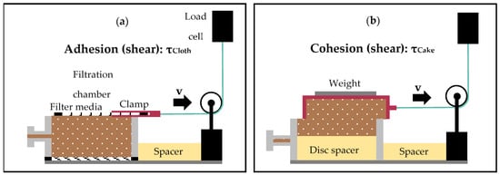 After filtration, it is possible to remove the cylinder together with cake and adhere filter media from the press. This allows subsequent positioning in a commercial tensile testing machine (velocity 10 mm·min−1) with minimal modification (Figure 5). First, the adhesion (shear) of the filter media was measured by a crescent-shaped clamp, as proposed by Ginisty [], by pulling of the fabric. Then, the cake was pushed halfway out of the cylinder using a disc spacer and afterwards the top half was sheared off with a lid to determine the cohesion (shear) of the cake analogues to a Jenike shear cell []. The maximum of the force-displacement curve related to the shear area represents the respective measured stress value. If the filtration is considered as preconsolidation and thus as preshearing of the network of solid particles, each shearing test value describes one point of the yield point, depending on the associated pair of values from normal stress and resulting shear stress. Different normal stresses can be realized by weight disks on the lid. In this way, a yield locus is obtained for each pressure and each cake post-treatment [].