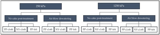 To investigate the influence of compaction, filtrations were performed at 250 kPa and 1250 kPa. For each pressure, there were tests with filtration only and tests with a dewatering cake post-treatment, as can be seen in Figure 6. This was a gas differential pressure dewatering at 250 kPa for filtrations at 250 kPa and at 550 kPa for filtrations at 1250 kPa. A pressure of 550 kPa is an industrially used value for gas differential pressure dewatering. However, gas differential pressure is limited by the filtration pressure (danger of cake back flow). So, 250 kPa was the maximum pressure usable for 250 kPa filtration pressure.