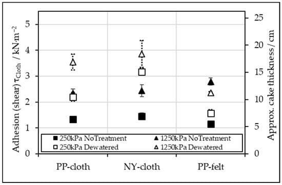 First, the shear adhesion values of the different fabrics for two filtration pressures and two cake post-treatments are presented. A plot of the shear stress to be applied for the individual fabrics is given in Figure 7, including the standard errors of the means. The black data series represents the measured values of saturated cakes and the white data series those of dewatered (undersaturated) cakes. The lowest adhesion is found for the lower filtration pressure (250 kPa) and a fully saturated cake (S = 1) for all fabrics. Dewatering after filtration at 250 kPa increases adhesion for all fabrics. The same applies to an increased filtration pressure (1250 kPa). For example, the adhesion of the PP cloth is approximately twice as high after a filtration at 1250 kPa without post-treatment than at 250 kPa without post-treatment, i.e., an almost twice as thick cake would be required to fulfill the detachment condition. Dewatering of the cakes formed at higher filtration pressure further increases adhesion for the PP cloth at 250 kPa and 1250 kPa, the NY cloth at 250 kPa and 1250 kPa and the PP felt at 250 kPa, comparing measurements at the same filtration pressure level. These findings are consistent with theoretical considerations of fewer contact points and literature data on saturation influence. Only the felt filter media for filtrations at 1250 kPa show an exception to this. Adhesion is slightly decreasing after dewatering. This results from the fact of a structure with lower permeability compared to the cloths reducing dewatering performance. Therefore, dewatering after 1250 kPa filtration has no further adhesion-increasing effect. For the iron ore tailings, 5 kN·m−2 corresponds approximately to 25 cm cake thickness by assuming a residual moisture of 20 w-%, ρSolid of 3050 kg·m−3, ρFluid of 1000 kg·m−3, a full saturated cake (S = 1) and no sealing edge.