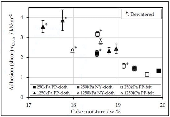 Adhesion (shear) τCloth referred to corresponding residual cake moisture of filtrations at different filtration pressure levels, with and without cake post-treatment by dewatering.