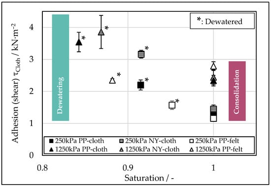 However, detachment behavior cannot be simply described by only using the adhesion of the cake to the fabric. This is obvious regarding the possible detachment cases mentioned above and the underlying interactions of the different stresses. Further differentiation is necessary, and the structure of the cake must be considered. First, the understanding of the adhesion increase with decreasing residual moisture is useful. In fact, the residual cake moisture is resulting out of two different processes. One is compacting, and the other is dewatering. Therefore, if only the residual moisture is considered, information becomes lost. The effect of the different influences is visible, for example, in the representation of the adhesion referred to in the saturation of the network of solid particles (Figure 9). The networks are completely saturated (S = 1) for all filtrations without cake post-treatment of gas differential pressure dewatering. Depending on the available gas differential pressure (250 kPa or 550 kPa), further undersaturation and even higher adhesions can be achieved.