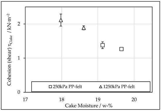 The determination of the adhesion of the cake to the filter cloth helps to determine the required cake thickness for detachment (See Figure 2a,b). However, no statement can be made about the occurrence of the other possible scenarios (See Figure 2c,d). For these, the other stress states on and in the filter cake as well as their relationship to each other play an important role, e.g., the ratio of τCake/σCake, which indicates the brittleness of the network of solid particles in simplified terms. A first step is to determine the shear cohesion, i.e., the shear strength of the filter cake, using the procedure shown in Figure 5. Figure 10 shows the results of these cohesion measurements for the PP felt media over residual moisture. Analogous to shear adhesion, an approximately linear relationship between shear cohesion and residual moisture content is evident, regardless of whether the lower residual moisture content results from increased compaction (due to a higher filtration pressure) or undersaturation (gas differential pressure dewatering)