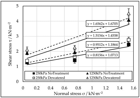Furthermore, the determination of the ratio of τCake/σCake can be carried out by determining the yield loci and expanding them into negative normal stresses. How these curves are to be expanded is discussed controversially []. Linear extrapolation of the yield locus slope at σ = 0 is a common simplified way to describe the relationship between τCake and σCake. However, this overestimates the tensile strength and underestimates τCake/σCake, respectively. Nevertheless, a statement about the detachment behavior can already be derived from the ratio of the slopes. This is discussed using the example of the yield loci for filtration at 250 kPa and 1250 kPa using the PP felt media for no post-treatment of the cake and gas differential pressure dewatering (Figure 11). When looking at the linear fit, a higher slope, which is similar to the ratio of τCake/σCake at a higher filtration pressure, can be observed. Qualitatively, scenario c is thus less probable with filtration at 1250 kPa. A slight impact by cake post-treatment can be stated as well.