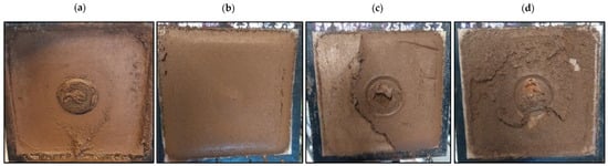 The presented different scenarios a–d of cake detachments can be observed in laboratory tests. Figure 12 shows images of each scenario after filtration of the iron ore tailings using PP cloths in the laboratory recessed plate filter press. The first image shows scenario a, which is a complete detached cake after a filtration with 5 mm chambers at 250 kPa filtration pressure without cake post-treatment. In the next image, scenario b, a complete sticking cake can be seen after a filtration with 5 mm chambers at 250 kPa filtration pressure and without cake post-treatment. The third image shows a shear breaking (scenario c) after a filtration with a 5 mm cake at 250 kPa filtration pressure and without cake post-treatment. Scenario d is a breaking parallel to the cloth, which could often be observed after filtration with cake dewatering as shown in the image on the right side. This was also taken after a filtration at 250 kPa with 5 mm chambers and air blow.