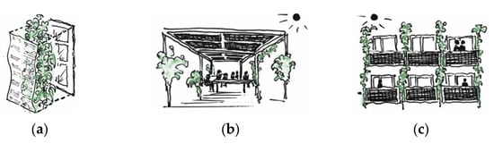 The students developed a methodology for comparing systems for building greenery and BIPV. Even though the comparison was challenging due to fundamental differences between the two systems, the evaluation helped to reveal their potential and benefits. Moreover, it supported the process of creative ideation for developing effective hybrid systems. Using this, the students developed several ideas for beneficially combining photovoltaics and greenery into hybrid systems (see Figure 2). However, intelligent combinations of both systems require an in-depth comprehension and a thorough knowledge of both technologies, and their mutual interactions and the exploitation of synergy effects do not necessarily lead to fundamental advantages [,,,].