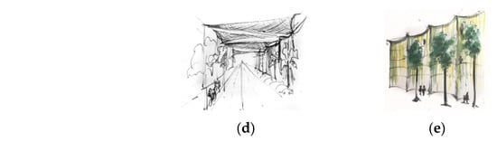 Ideas for hybrid systems: (a) Transparent photovoltaic curtains in front of vertical greenery systems; (b) Photovoltaic shading above roof gardens; (c) Balconies with green separations and photovoltaic balustrades; (d) Photovoltaic shadings above the street space; (e) Transparent photovoltaic curtains around existing street trees.