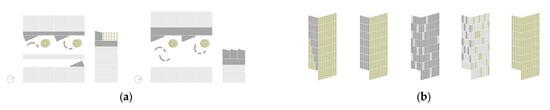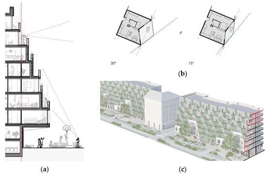 All three design concepts were further pursued, systematically combined, and iteratively developed while considering the opinions and advice of different experts (see Figure 6). Identical to the design project ‘Modular’ (see Section 3.2.1), the preservation of existing street trees was prioritised, and the added building volume was erected at an adequate distance from the vegetation. The façade’s terrace-shaped protrusion into the additional five metres of open space available in Augustenstrasse provides additional floor space and private balconies for each apartment (Concept (b)). Moreover, the folding of the façade, as conceived in the preliminary design concept (c), increases the façade area and optimises its orientation to solar irradiation. The folding of the façade follows specific rules that are defined in an iterative process (see Figure A2), including interdisciplinary discussions and the students’ critical reflection of their own work: The lower storeys focus on the northern orientation with building greenery, thus increasing the amount of climate active vegetation that is more beneficial for human outdoor thermal comfort when applied close to the pedestrians. The façades of the upper storeys are predominately oriented towards the south, thus enlarging the already higher solar potential in the upper part of the buildings (Concept (a)). The definition of angles for the folds also considers the layout of the apartments and balcony dimensions. The balancing of increasing solar and green potential while maintaining appropriate floor plans leads to folding angles from 15 to 30°.