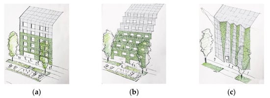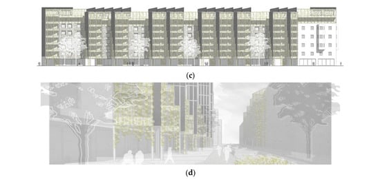 Development process of the ‘Under the city roofs’ façade design: (a) Façade concept 1: Superposition of green elements; (b) Façade concept 2: Vertically oriented façade greening; (c) Façade concept 2: Horizontally oriented façade greening; (d) Final façade concept.